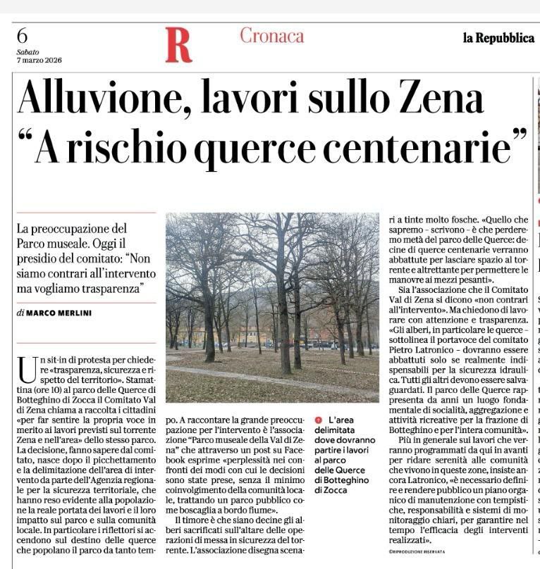 Alluvione, lavori sullo Zena. “A rischio querce centenarie” (QN 7 marzo 2026)