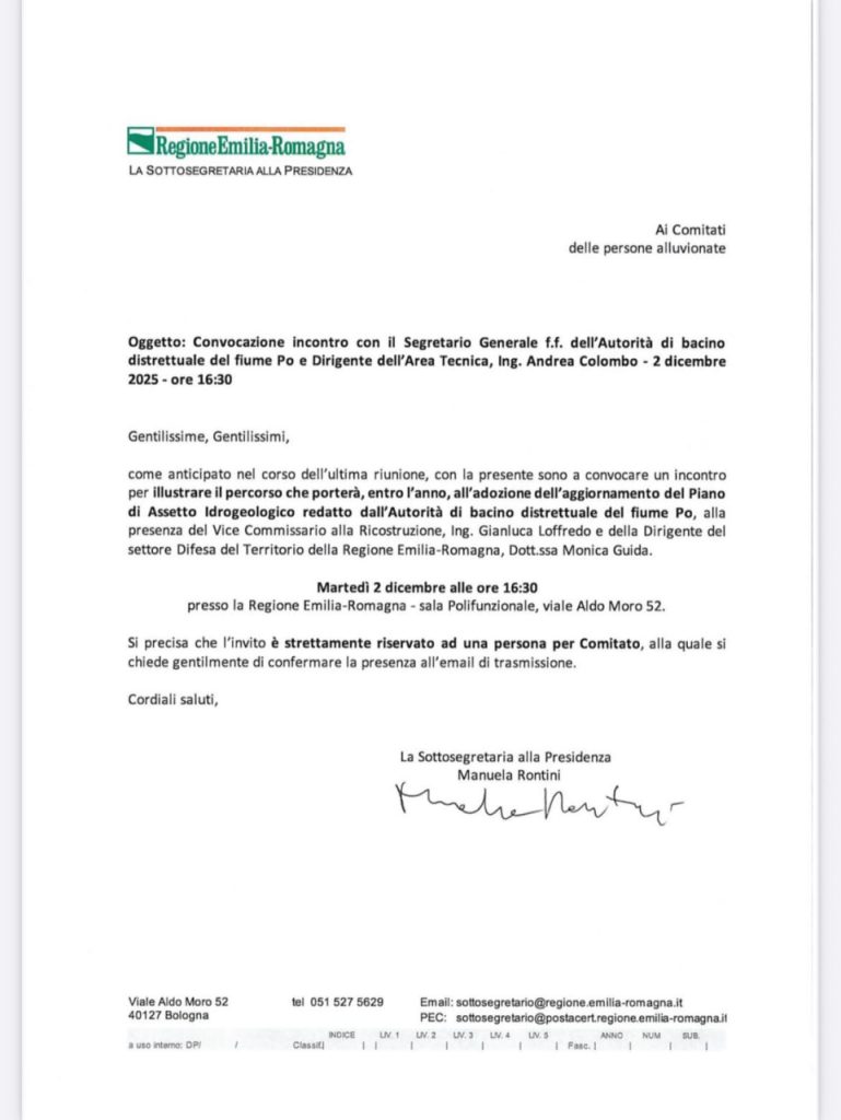 Il Comitato informa che, in vista del prossimo incontro con le istituzioni e gli enti tecnici, saranno presentate una serie di richieste e proposte prioritarie, con l’obiettivo di garantire una gestione efficace, trasparente e condivisa degli interventi post-alluvione.