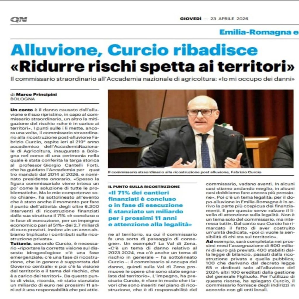 Le parole del Commissario Straordinario Curcio, pronunciate in occasione dell’apertura del 219° anno accademico dell’Accademia Nazionale di Agricoltura, rappresentano un richiamo forte e autorevole che condividiamo pienamente , commenta Pietro Latronico il portavoce del Comitato . Il suo richiamo agli enti locali – Città Metropolitana di Bologna e Regione Emilia-Romagna – a procedere senza ulteriori ritardi con le opere strutturali necessarie per la messa in sicurezza del territorio e della SP36 Via Zena, coglie un punto centrale che il Comitato Val di Zena denuncia da anni.